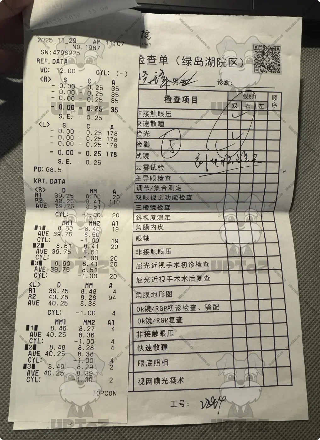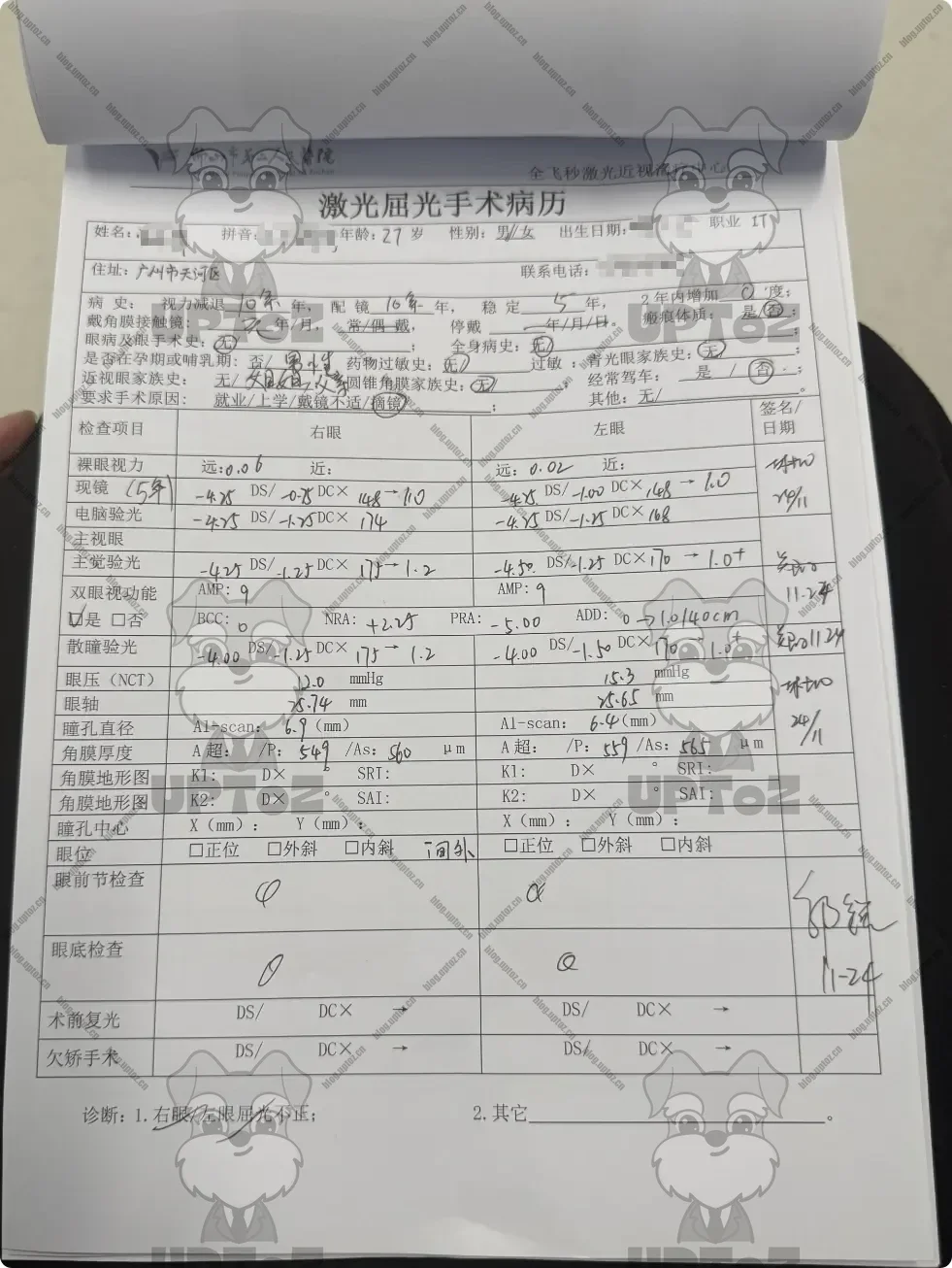 经过检查,护士小姐姐告知我的眼部条件呢非常好,可以做全飞秒、半飞秒和晶体植入。